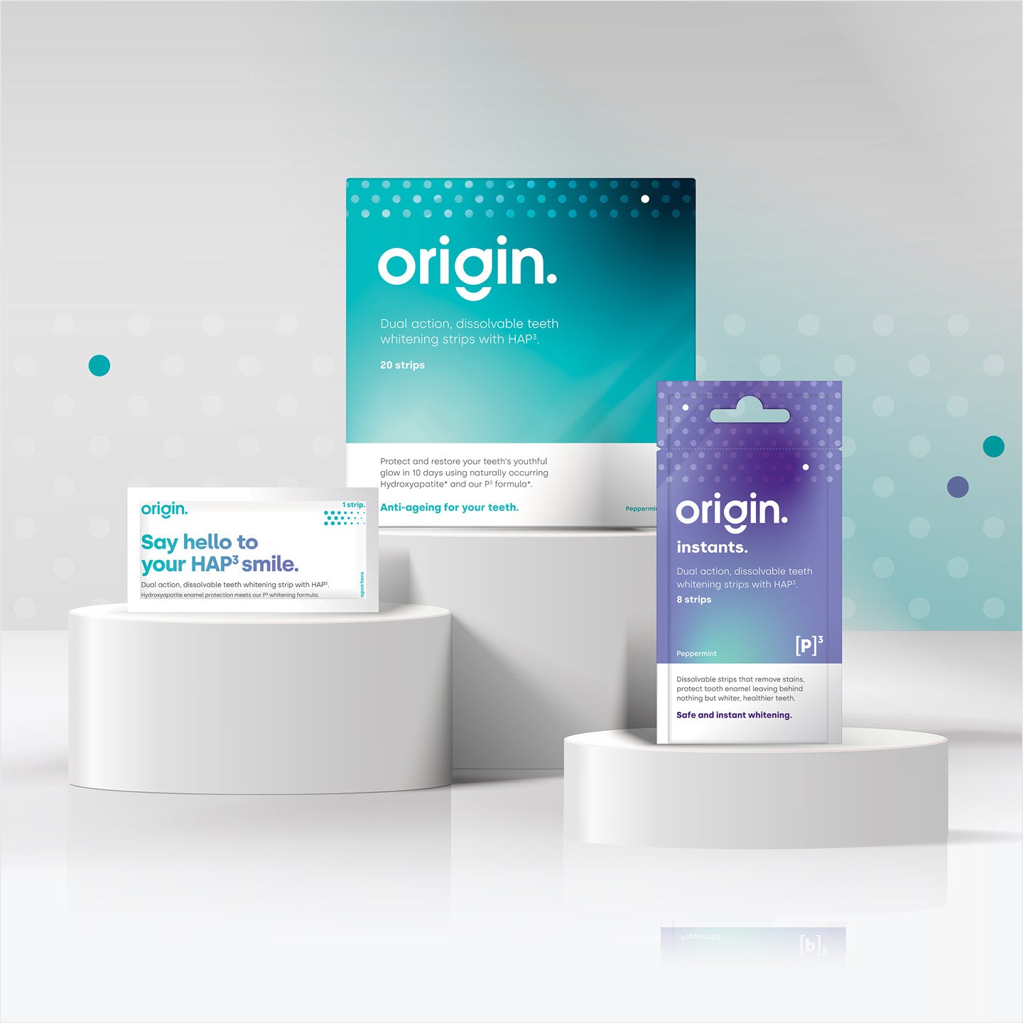 Origin dissolvable strips contain HAP3, a unique blend of our gentle [P]3 teeth whitening formula and naturally occurring Hydroxyapatite* enamel protection. This means a naturally strong, naturally brighter smile.